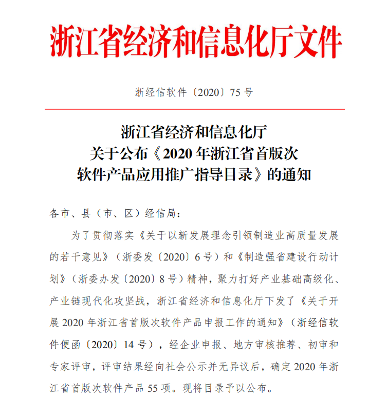 近日,浙江省經(jīng)濟(jì)和信息化廳發(fā)布了《2020年浙江省首版次軟件產(chǎn)品應(yīng)用推廣指導(dǎo)目錄》,確定 2020 年浙江省首版次軟件產(chǎn)品 55 項。
