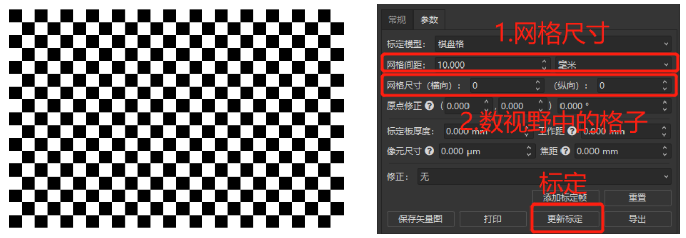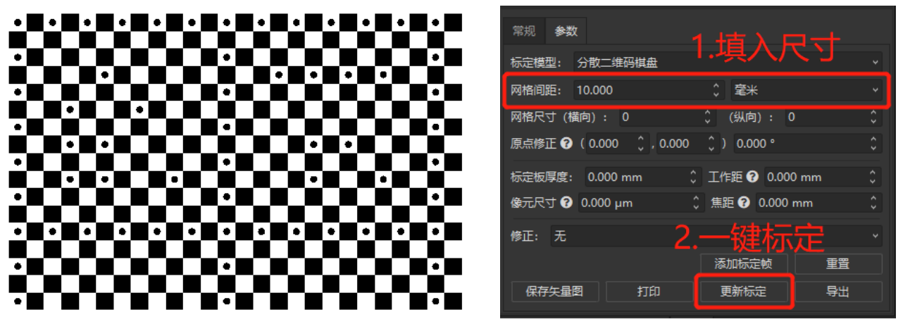 通過市場需求的調(diào)研,我們發(fā)現(xiàn)圖1中傳統(tǒng)棋盤格標(biāo)定的流程比較復(fù)雜,用戶除了需要知道網(wǎng)格的尺寸以外,還要通過數(shù)的方式確定在相機(jī)視野中的網(wǎng)格數(shù)量來完成標(biāo)定,如果實(shí)際應(yīng)用場景中網(wǎng)格間距尺寸比較小,用戶很可能數(shù)錯(cuò)導(dǎo)致最后標(biāo)定失敗。